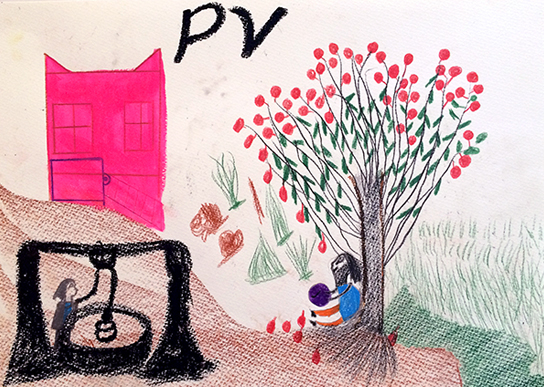 Der Brunnen von P.Der Brunnen steht in seinem afghanischen Heimatdorf auf dem Dorfplatz.Soft-Ton bemalt mit AcrylfarbenBuntstift und Kreide auf Papier